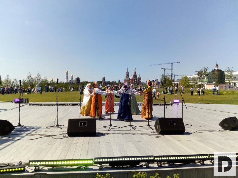 Открыли концертную программу самобытные умелицы клуба-студии «Чудо-мастерица». Они исполнили дефиле и танцы в русских костюмах 19 века. Интересно, что все свои костюмы мастерицы шили по старинным лекалам швей из разных областей старой Руси. Затем мелодичные и тягучие русские напевы сменила зажигательная зумба. Мастер-класс по танцевальной гимнастике «Зумба Голд» накрыл мощнейшей волной позитива весь Большой амфитеатр парка «Зарядья».