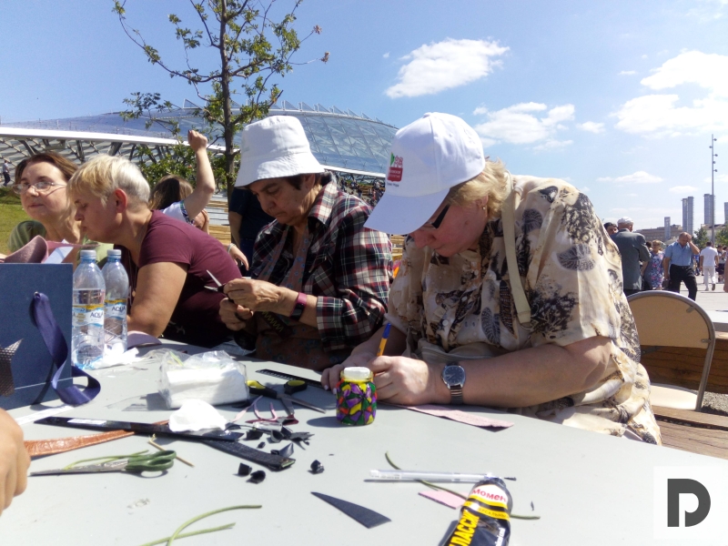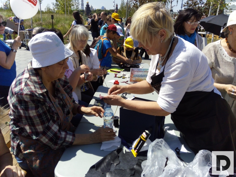 А в это же время, за сценой, на огромной лужайке с видом на кремлевские башни развернулись другие презентации программ проекта «Московское долголетие». Пожилые люди занимались скандинавской ходьбой, йогой, цигуном, рисовали картины, мастерили кожаные браслеты.